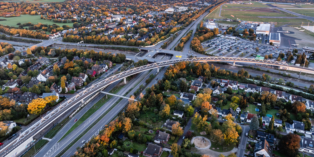 Mit dem Bau der Stadtbahnlinie U81 soll der Flughafen Düsseldorf an das bestehende Stadtbahnnetz angebunden und dadurch der öffentliche Nahverkehr verbessert werden. Die frei zu haltenden Verkehrsflächen unterhalb des Bauwerks erforderten den Entwurf einer semi-integralen Stahlbrücke mit einer Gesamtlänge von 441,2 m. Das mittig obenliegende Tragwerk ist als Fachwerkträgerkonstruktion über sechs Felder ausgebildet und ermöglicht die Querung des hochfrequentierten Verkehrsknotenpunkts Nordstern.