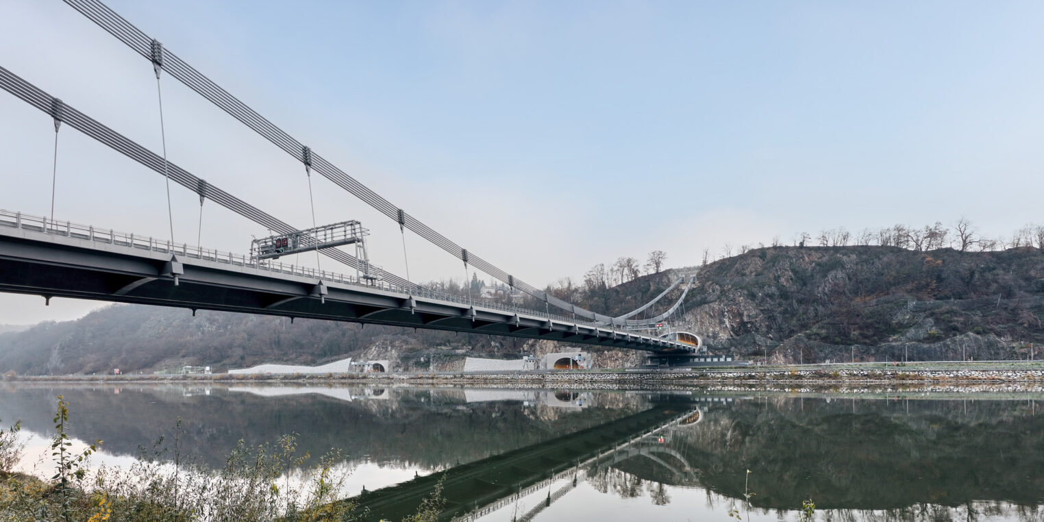 Die überzeugende Ingenieurleistung umfasst den Verzicht auf massive Pylone mit der Konsequenz einer aufwändigen Gründung und Verankerung im Fels, das mengen- und massenoptimierte Brückentragwerk sowie die komplexe Seilmontage und Justierung der Seilkräfte in den übereinander angeordneten Seilebenen. Für die Jury strahlt das Tragwerk eine beeindruckende und in sich stimmige Ingenieurästhetik aus.